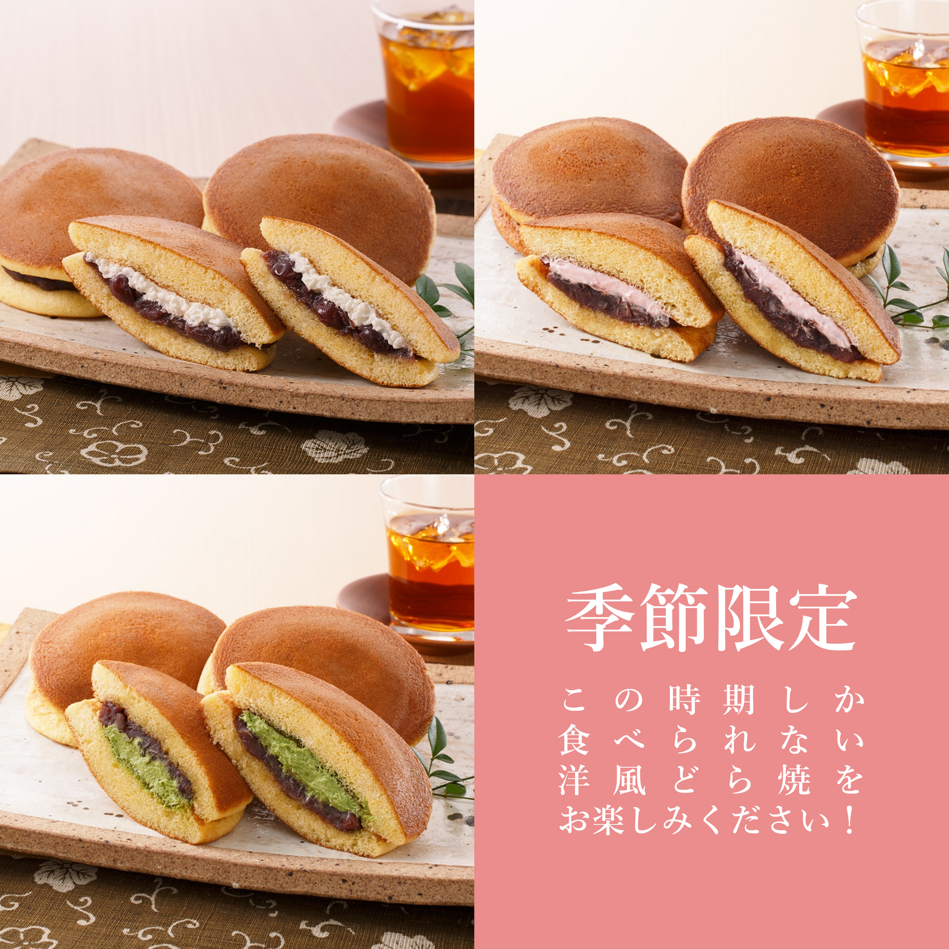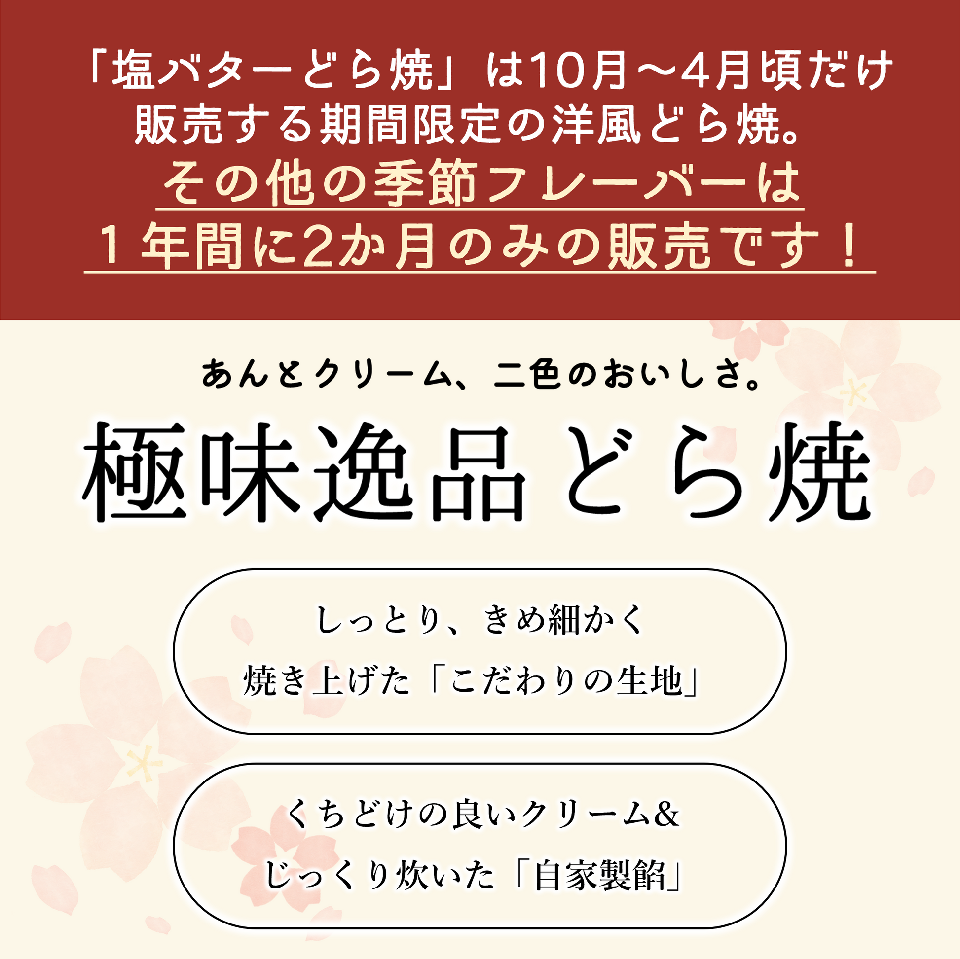 自家製餡とクリームを挟んだこだわりのどら焼<極味逸品シリーズ>。定番の塩バターどら焼は10月~4月までの期間限定発売で、その他季節フレーバーは2か月だけの販売です!この時期だけの3種セットをお楽しみくださいませ。