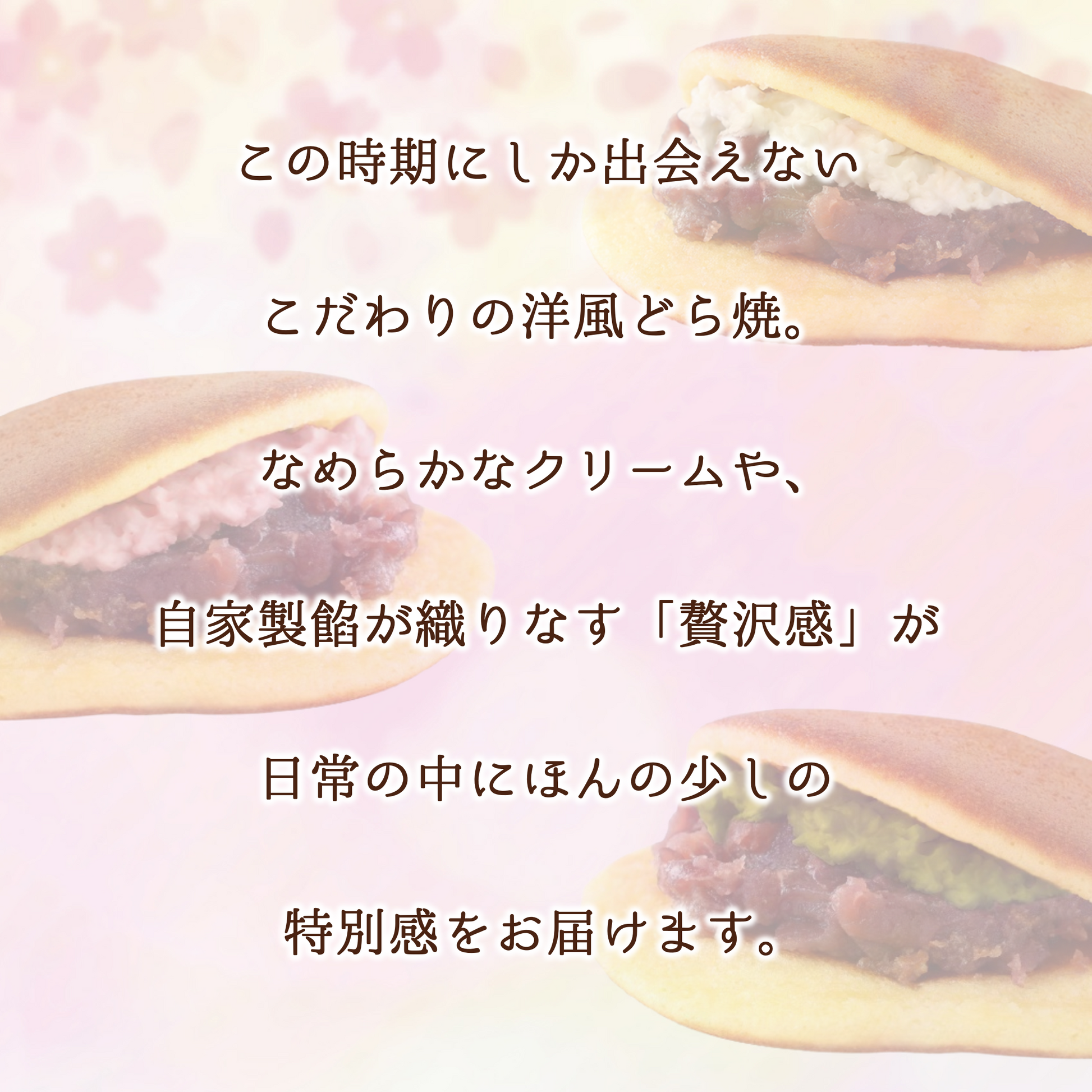 桜クリームどら焼:たまごをたっぷりと使用したこだわりの生地で、口どけの良い桜クリームと小豆粒あんをはさみました。