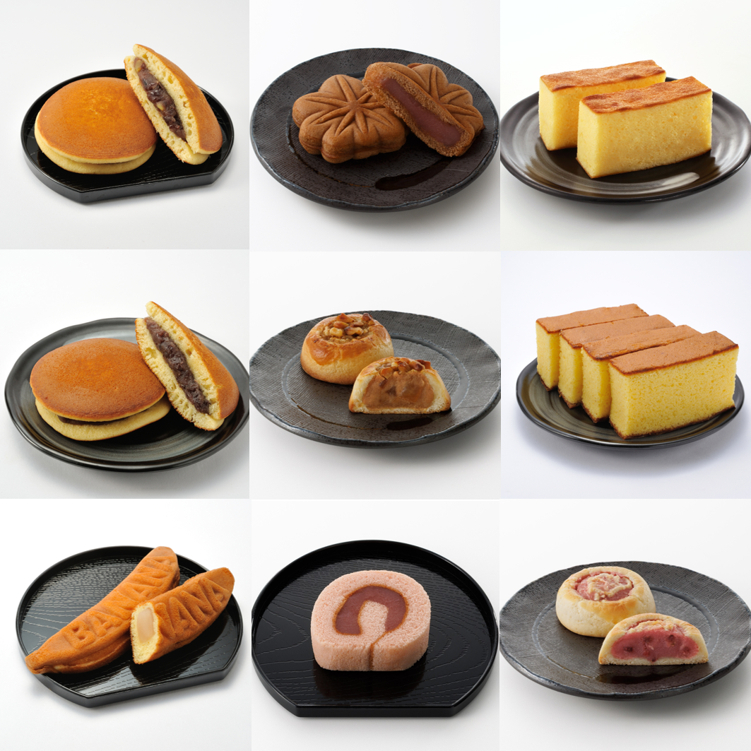 北海道小豆どら焼(3個)、ばなな2本入(2個)、長崎カステラ(1個)、ふわふわカステラ(1個)、栗どら(3個)、りんごの贅沢タルト(3個)、いちごの贅沢たると(3個)、いちごタルト(3個)、苺ショコラもみじ(3個)