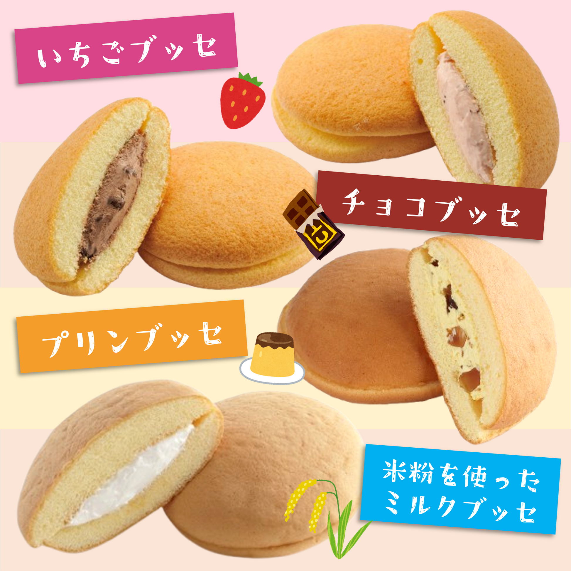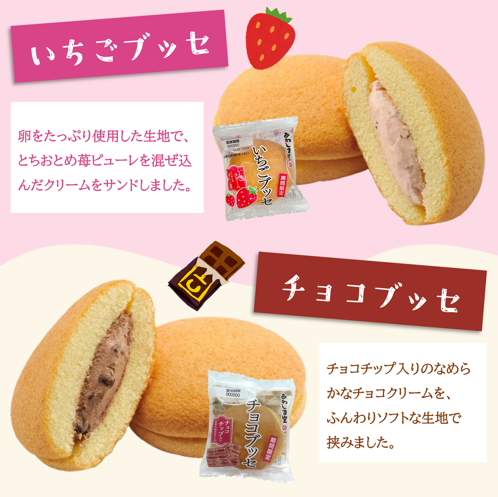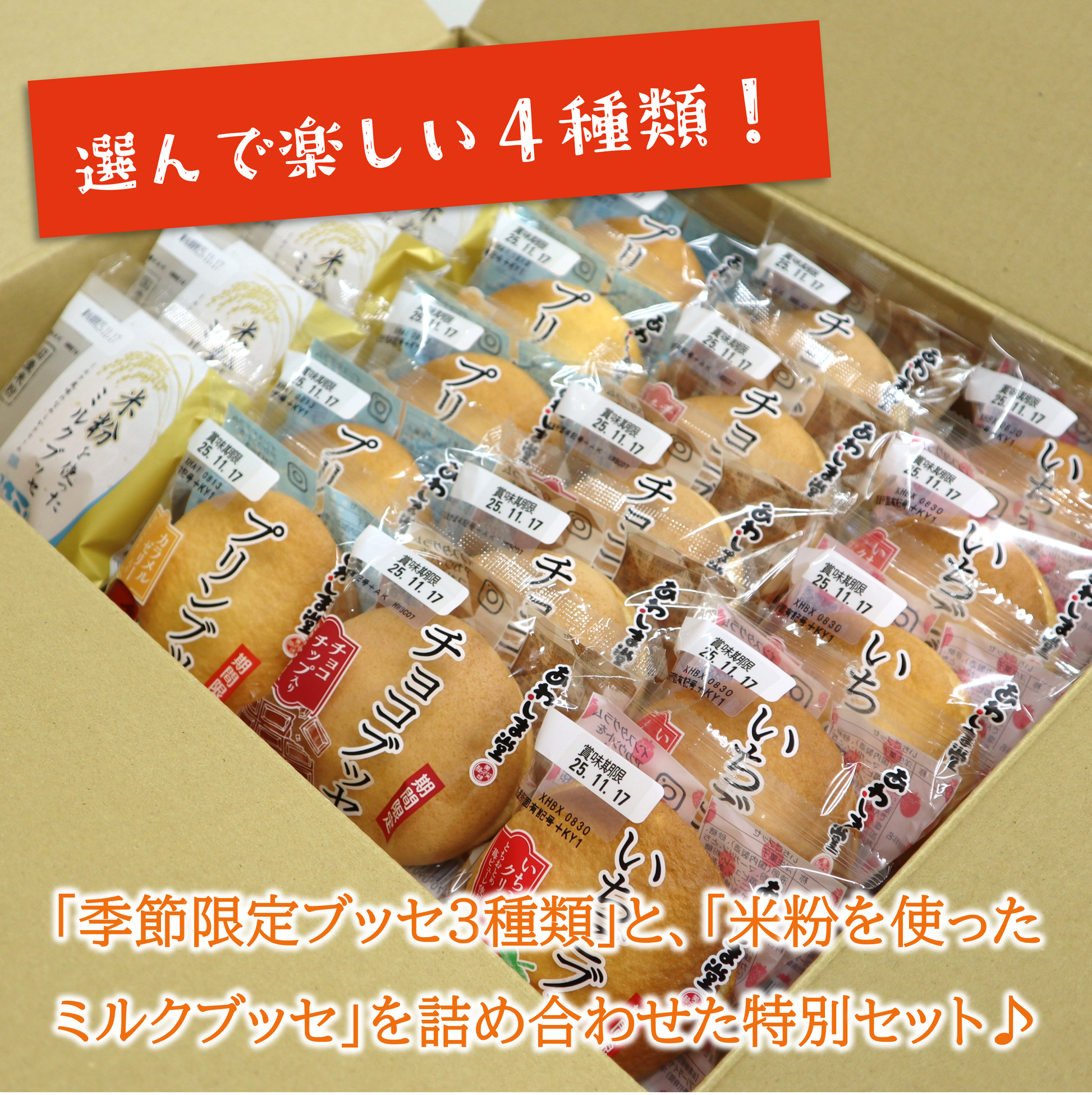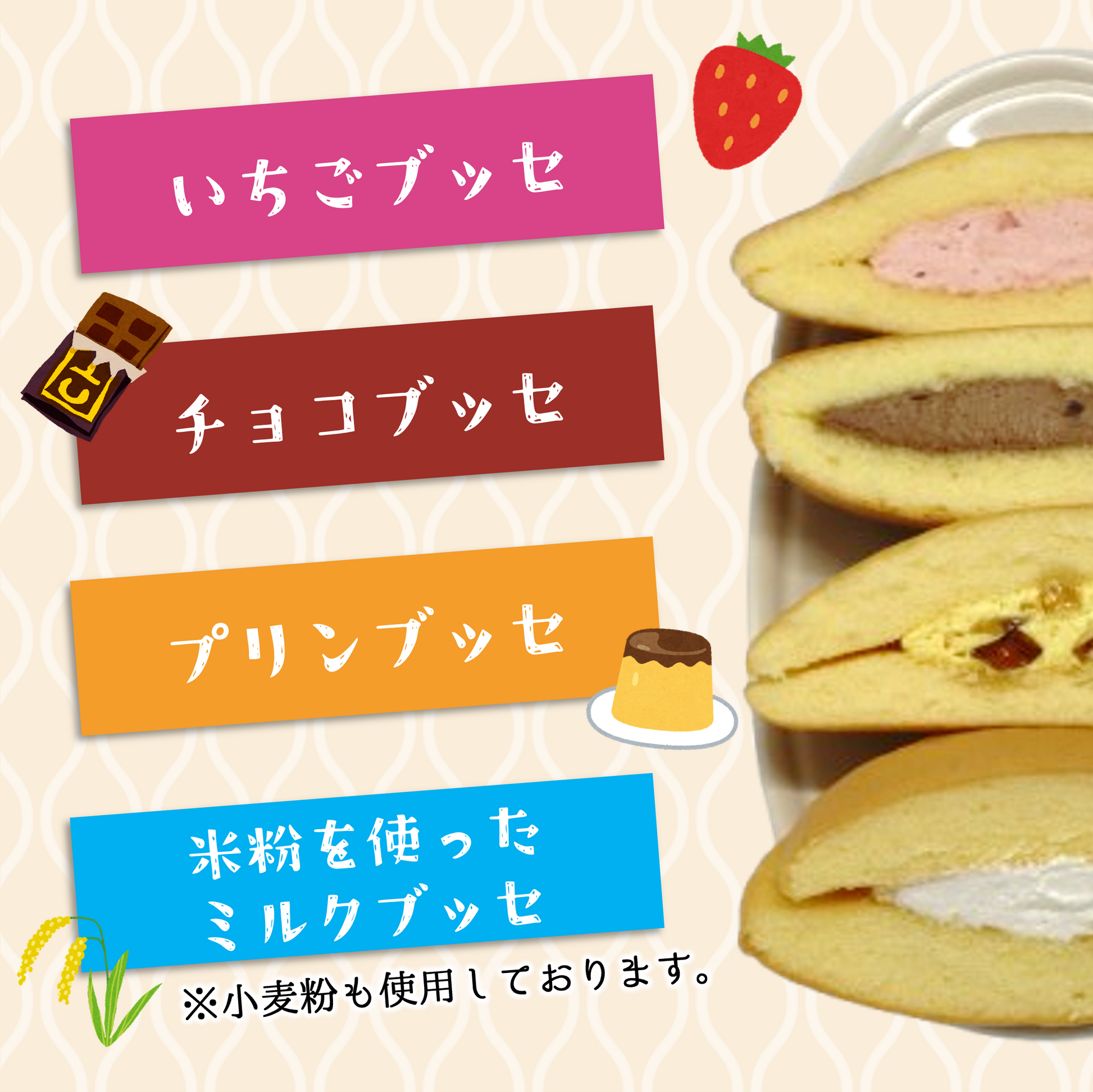 季節限定のいちご、チョコ、プリンブッセに加え、こだわりの米粉を使ったミルクブッセを詰め合わせたセットです。