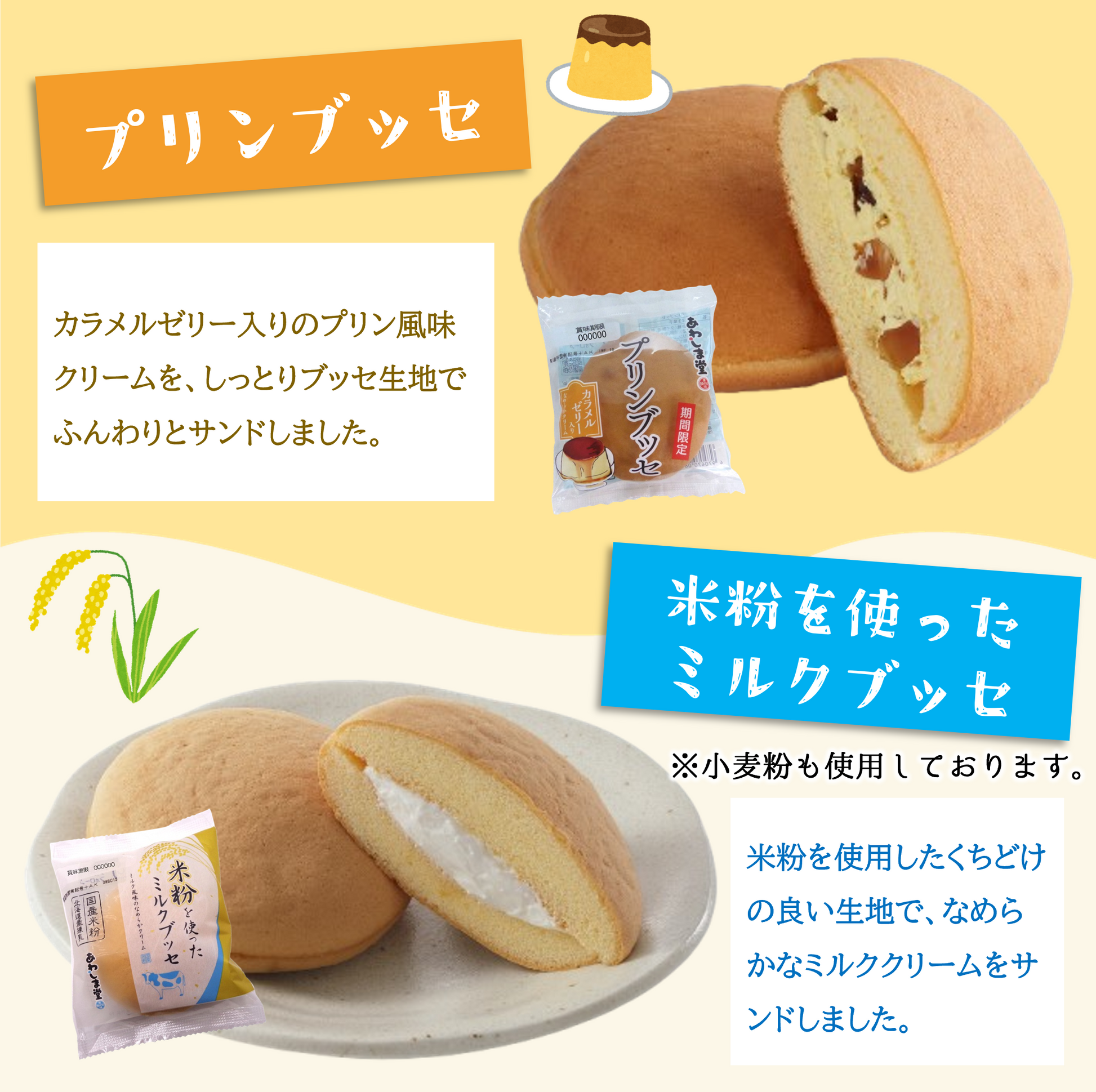 米粉を使ったミルクブッセ:米粉を使用したくちどけの良い生地で、なめらかなミルククリームをサンドしました。