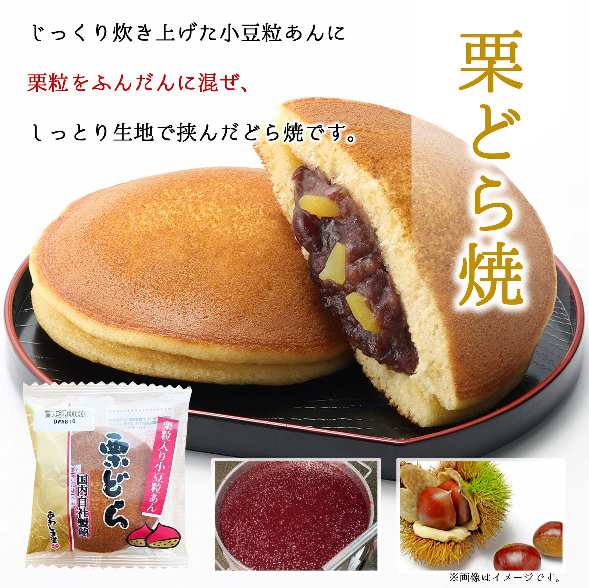 【栗どら】砂糖(タイ製造、韓国製造)、液卵、小麦粉、小豆、水あめ、栗甘露煮、シロップ、植物油脂、はちみつ、醤油/ソルビット、加工でん粉、膨脹剤、乳化剤、香料、酵素、着色料(カロチン)、(一部に小麦・卵・乳成分・大豆を含む)