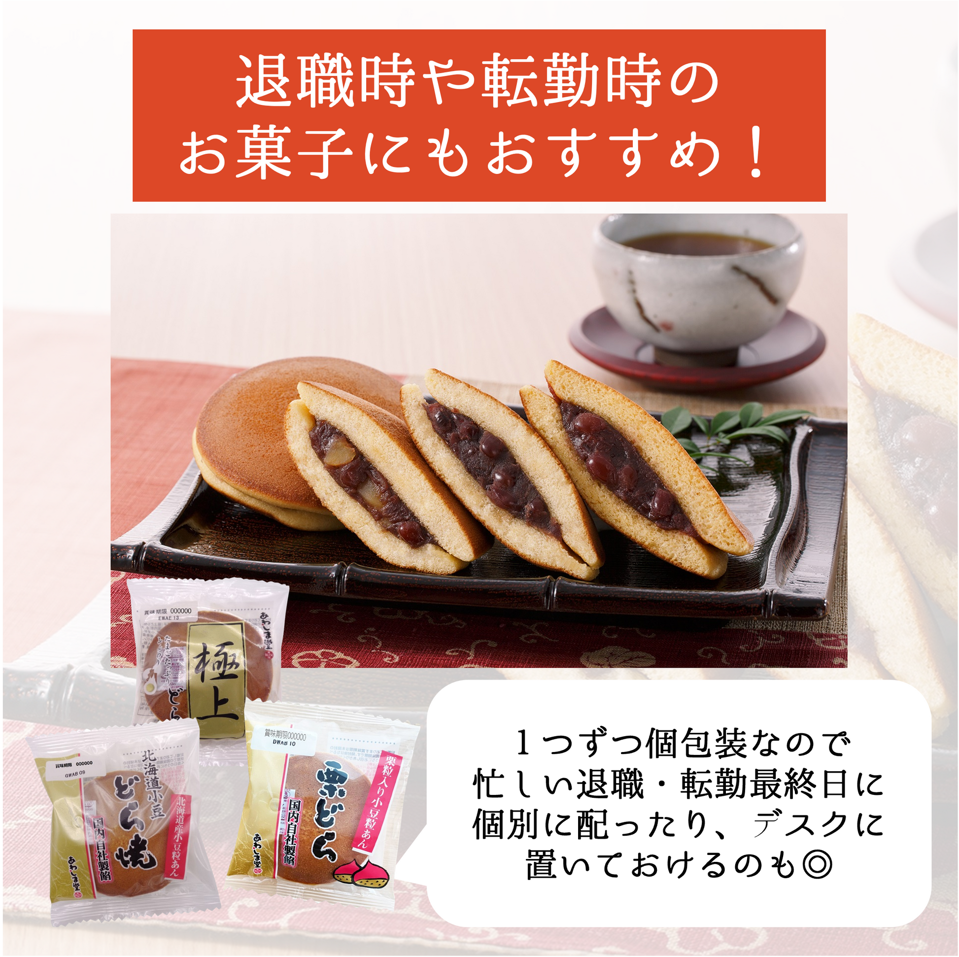 【極上どら焼】砂糖(国内製造、タイ製造、その他)、液卵、小麦粉、小豆、水あめ、液卵黄、植物油脂、はちみつ、醤油、デキストリン、寒天/ソルビット、加工でん粉、膨脹剤、乳化剤、増粘多糖類、香料、着色料(カロチン)、(一部に小麦・卵・乳成分・大豆を含む)
